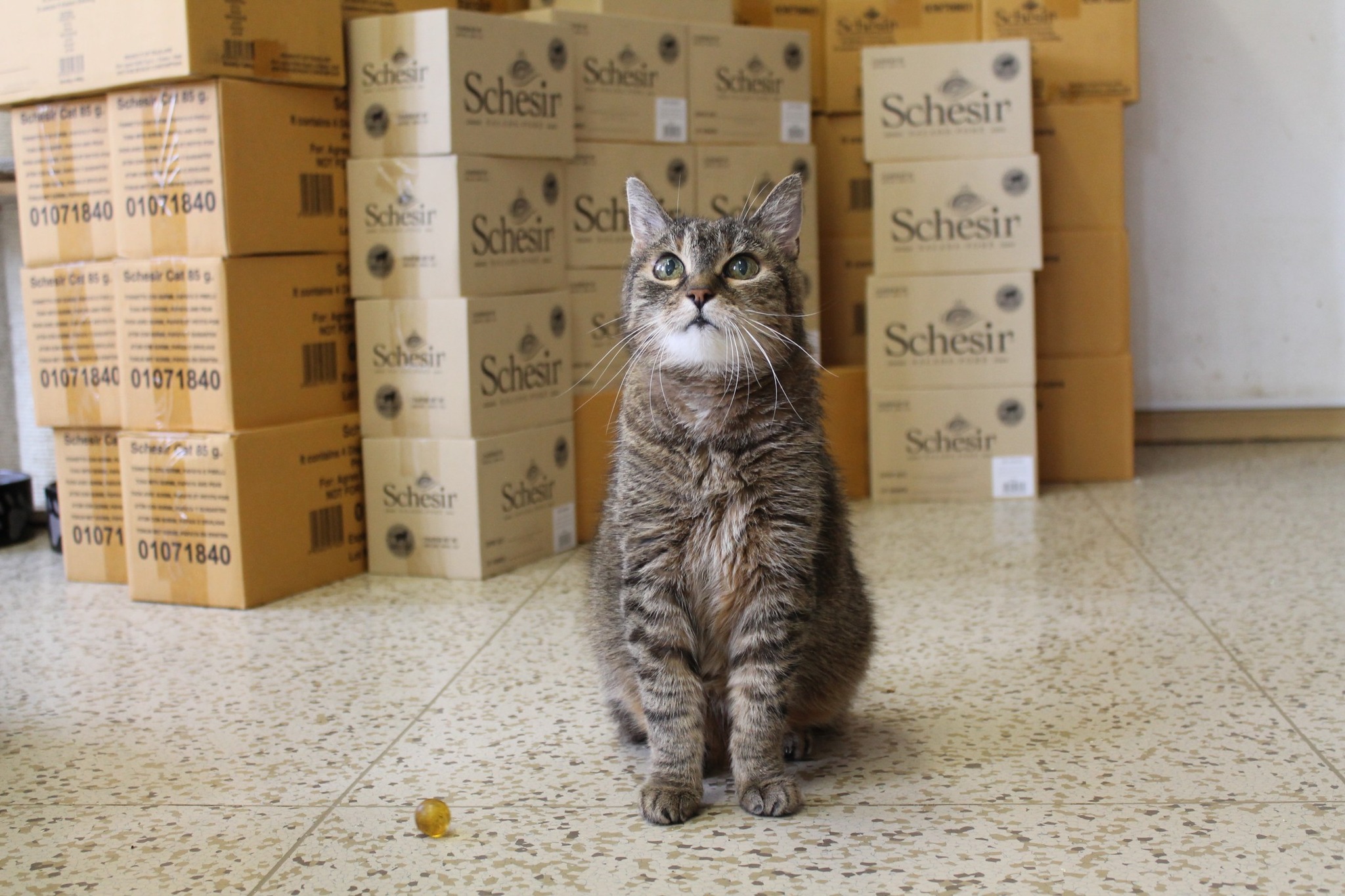 V depozitu máme aktuálně 117 kočiček, včetně spousty koťat, která potřebují častější krmení. Denně spotřebujeme kolem 14 kilo mokrého krmiva – a to do toho nepočítáme granule.