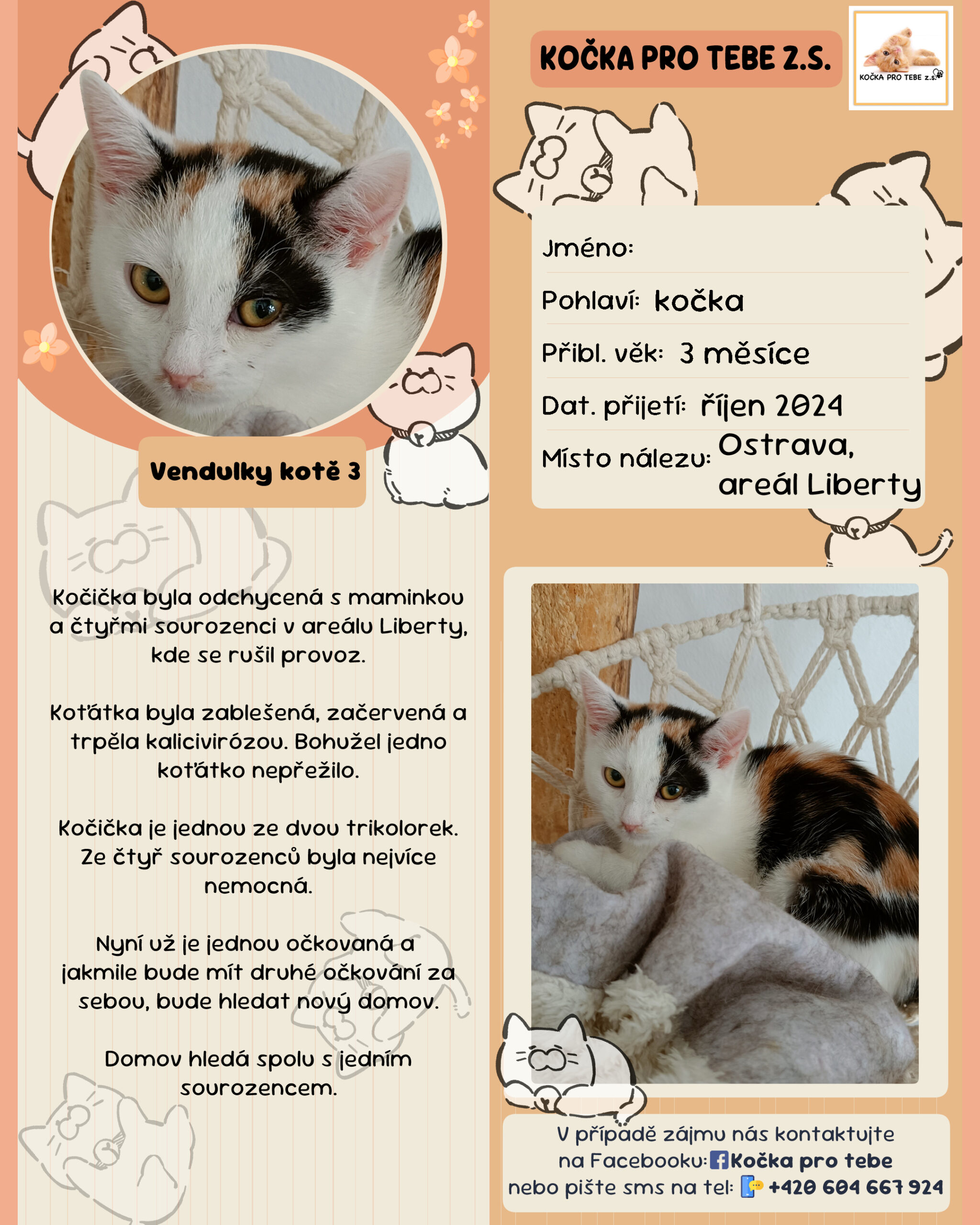 Je to ale koťátko a chtěli bychom, aby šla do nového domova buď k další kočičce, nebo s nějakou kočičkou z depozitu – třeba se sourozenci Rozárkou, Žofkou a nebo se Špagetkou.