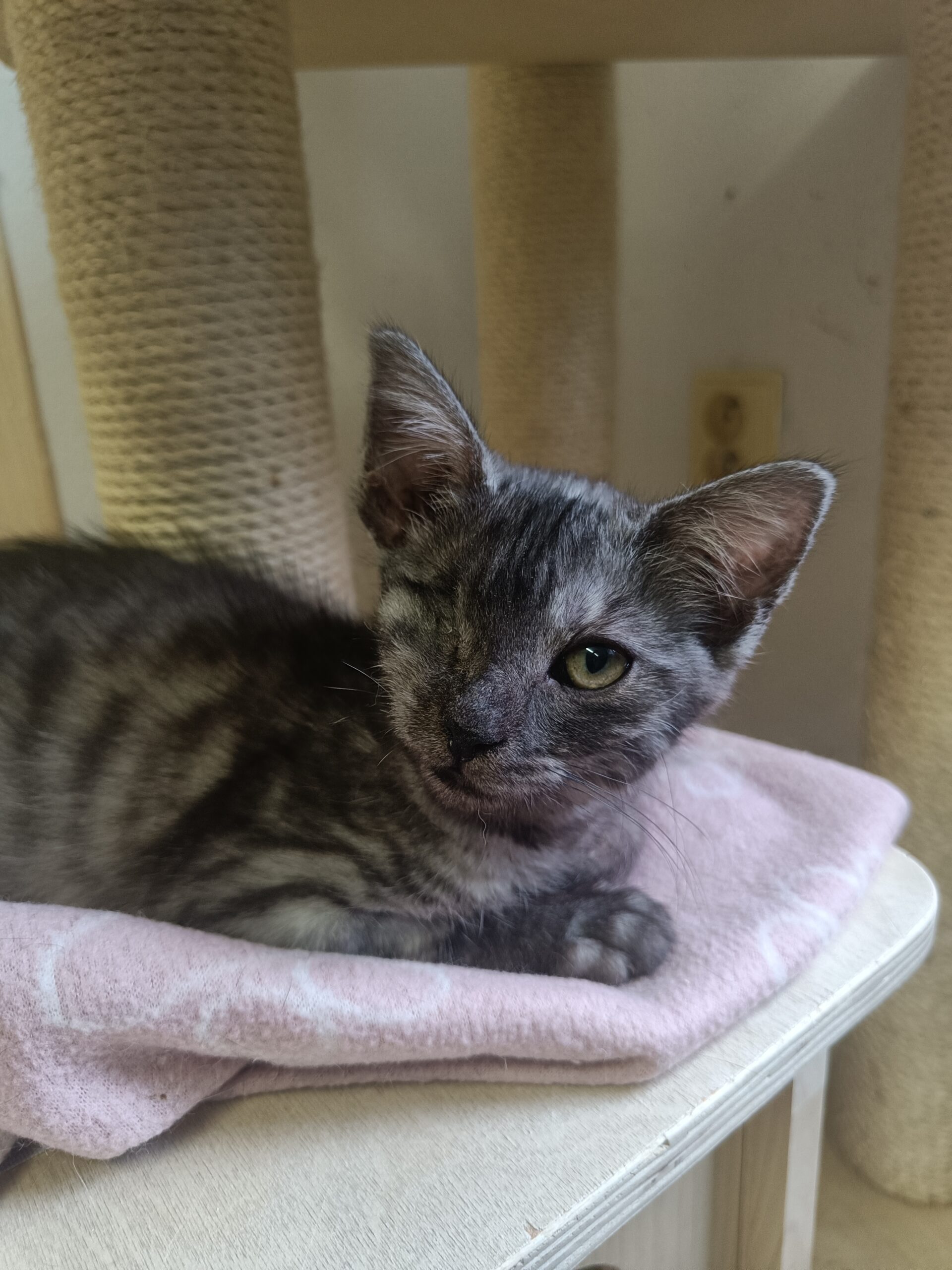 Bohužel včechna koťátka dostala herpes a Sally byla postižena nejvíc – měla velmi zesažené očičko, které bylo potřeba vyoperovat. Zdá se však, že ji to vůbec nevadí. Rána po očičku už je skoro zahojená.
