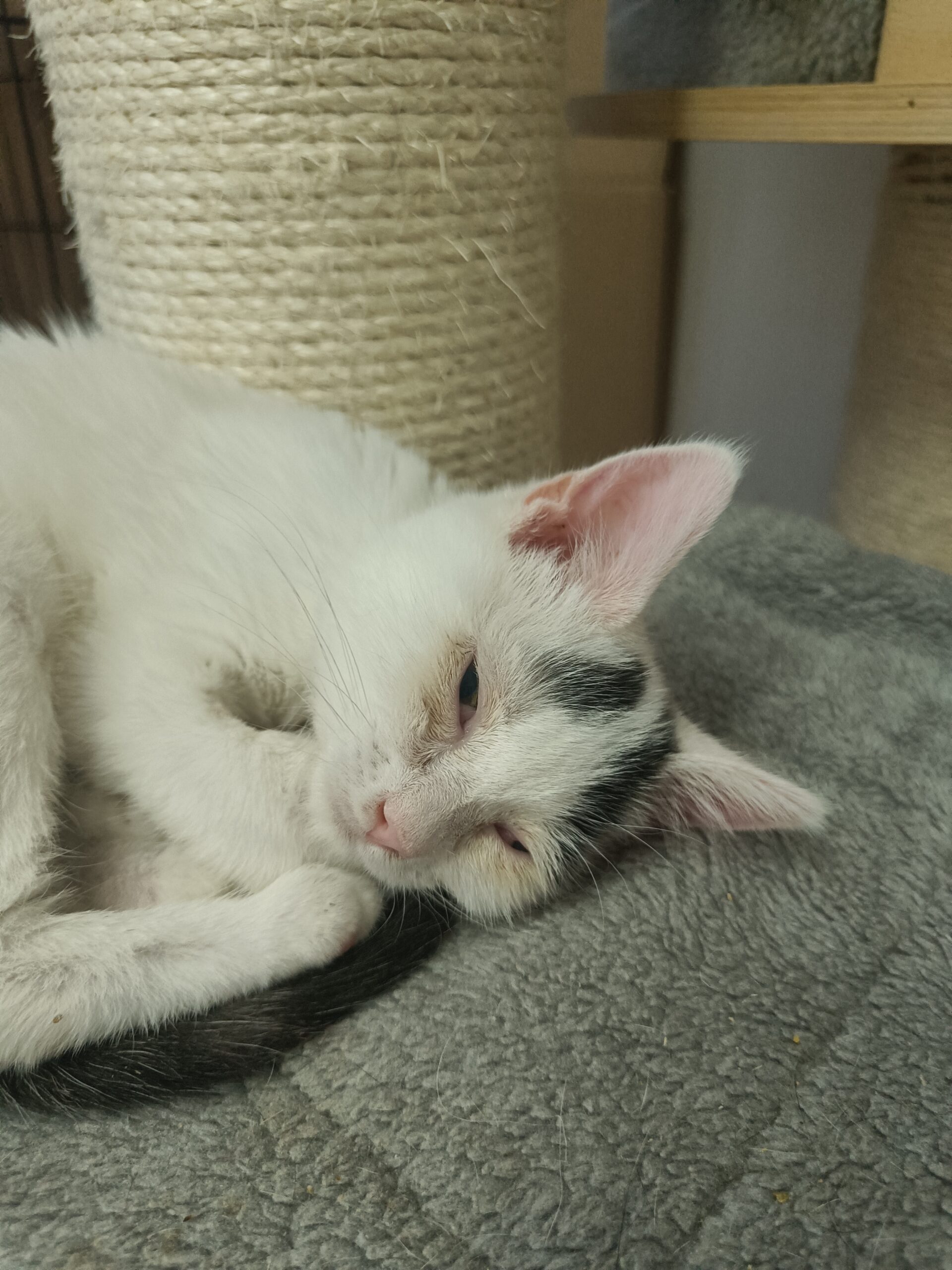 Strašně moc jsme si přáli očička zachránit, proto je potřeba několikrát denně je čistit a mazat. Očička už slepená nemá a už nejsou nateklá, ale ještě má před sebou do plného zotavení kus cesty. Věříme, že se nám očička zachránit podaří.