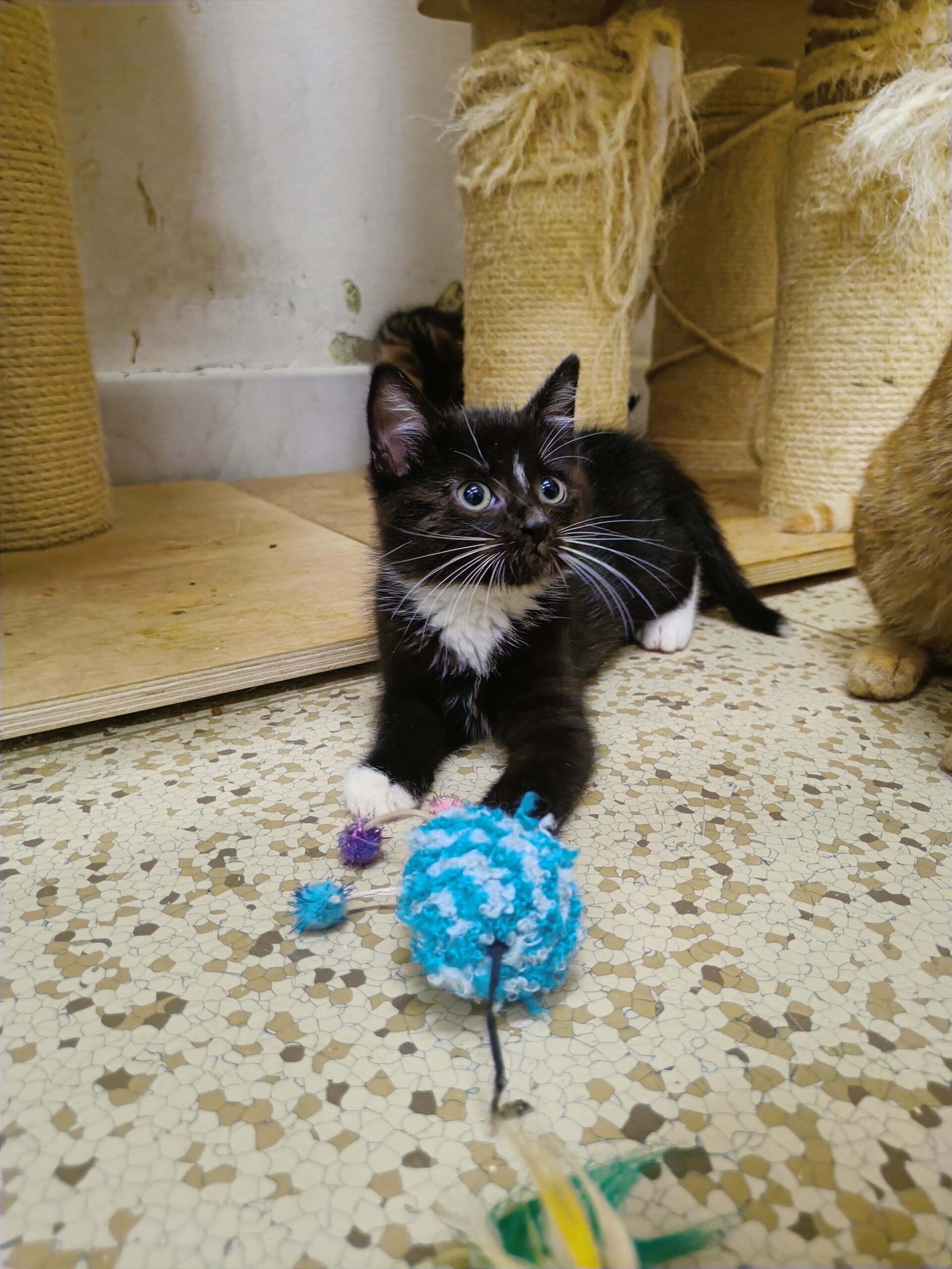 Koťátka se teprve učí, že se bát nemusí. Někteří to poznali rychle, jiným to jde pomaleji. Lenny je jedním z mazlivějších koťat.