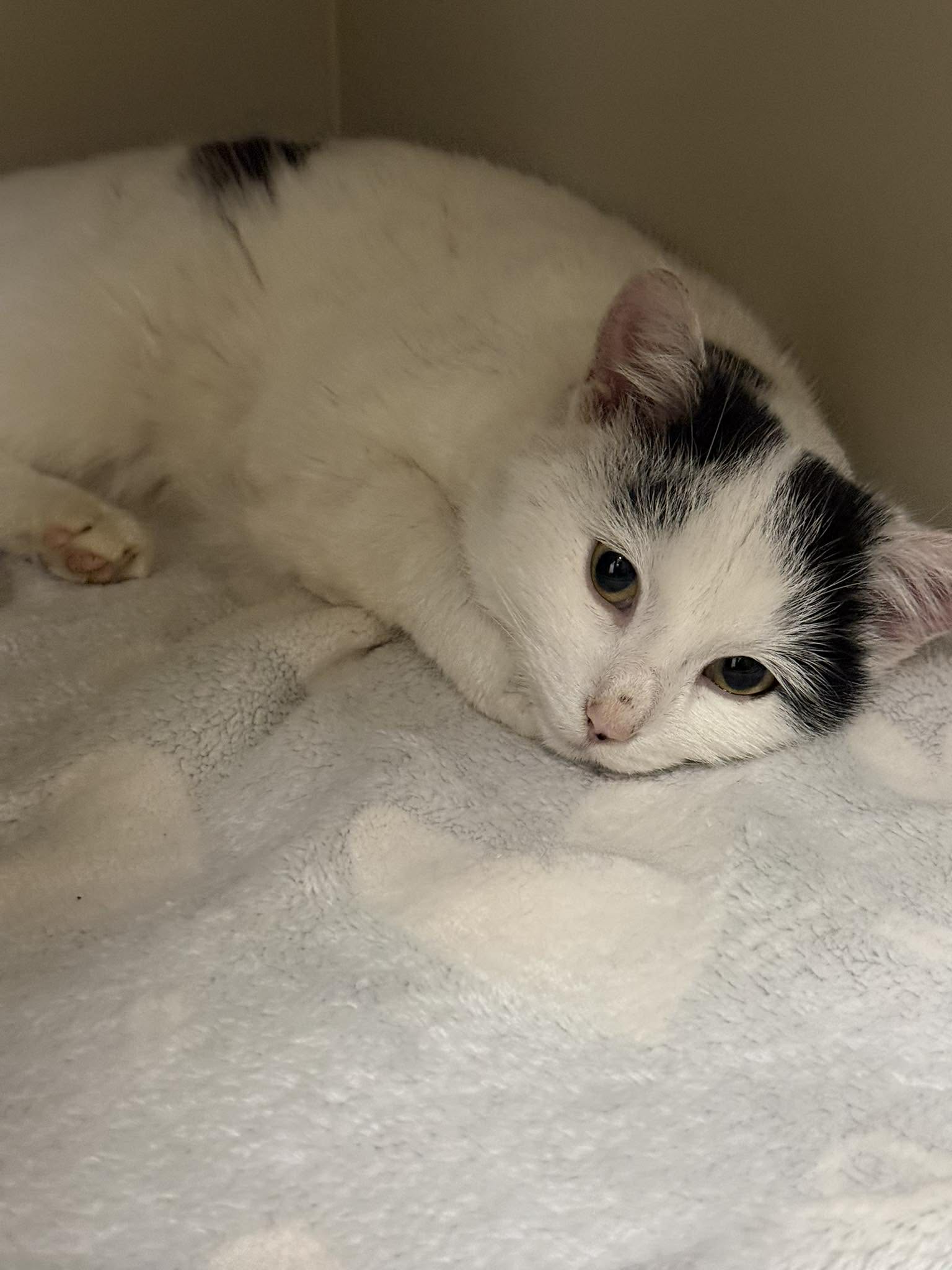 Černobílá Rebeka je u nás zatím velmi krátce. Byla nalezena na vrátnici jedné firmy, když se tam nějak zatoulala. Měla poraněné ouško, jakoby spálené – nejspíše umrzlé.